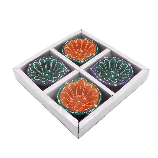 Diwali Decorated 4 Diya Lamps made from clay with Candle.